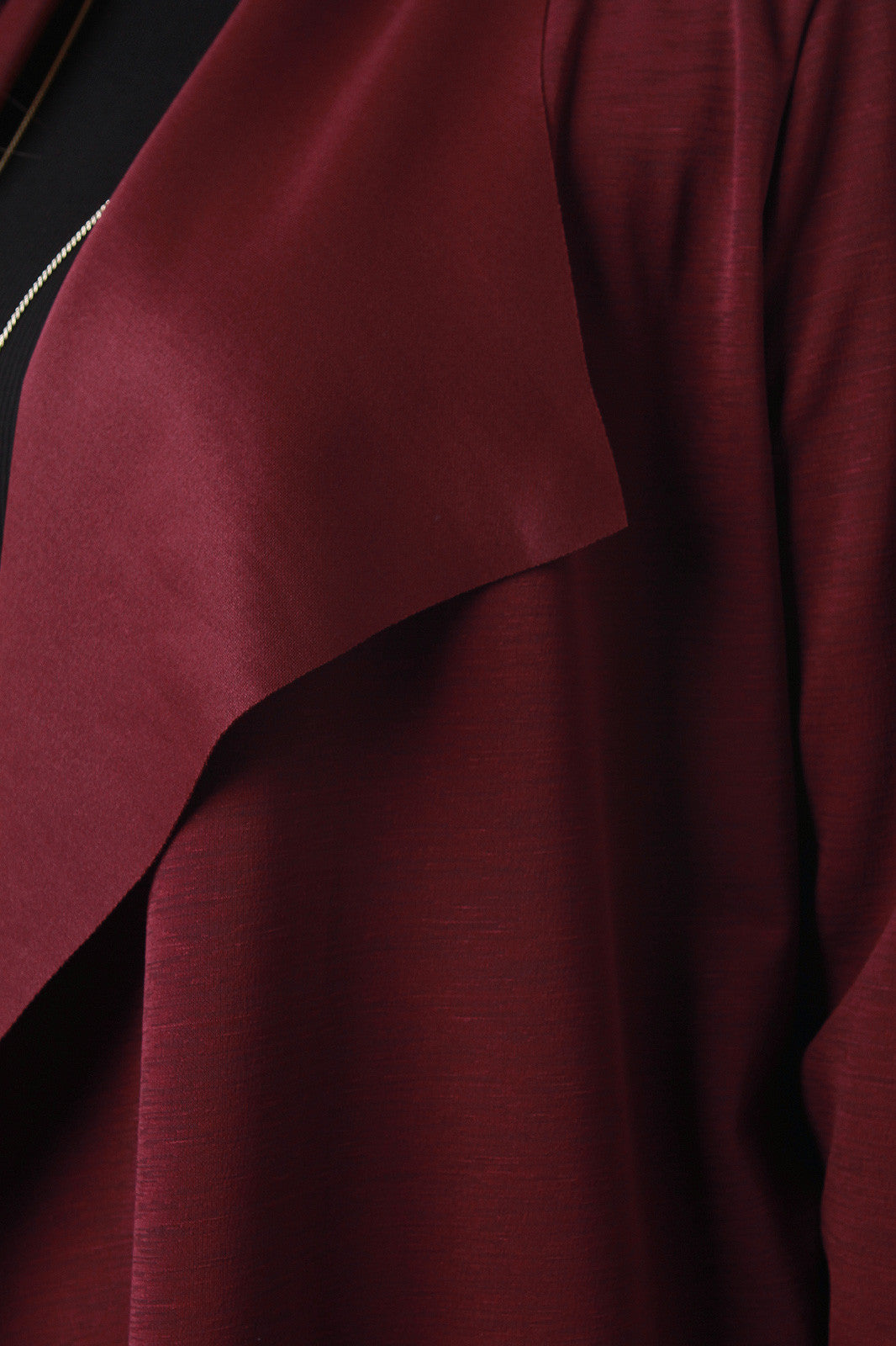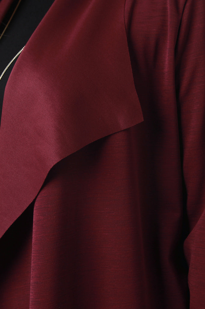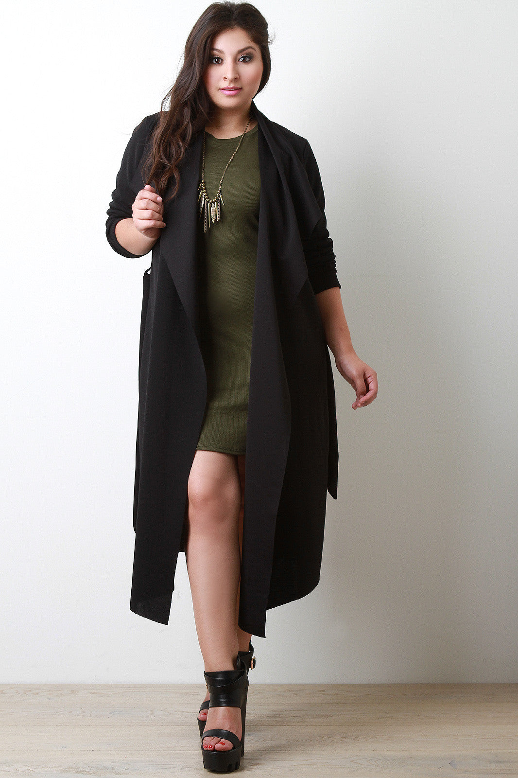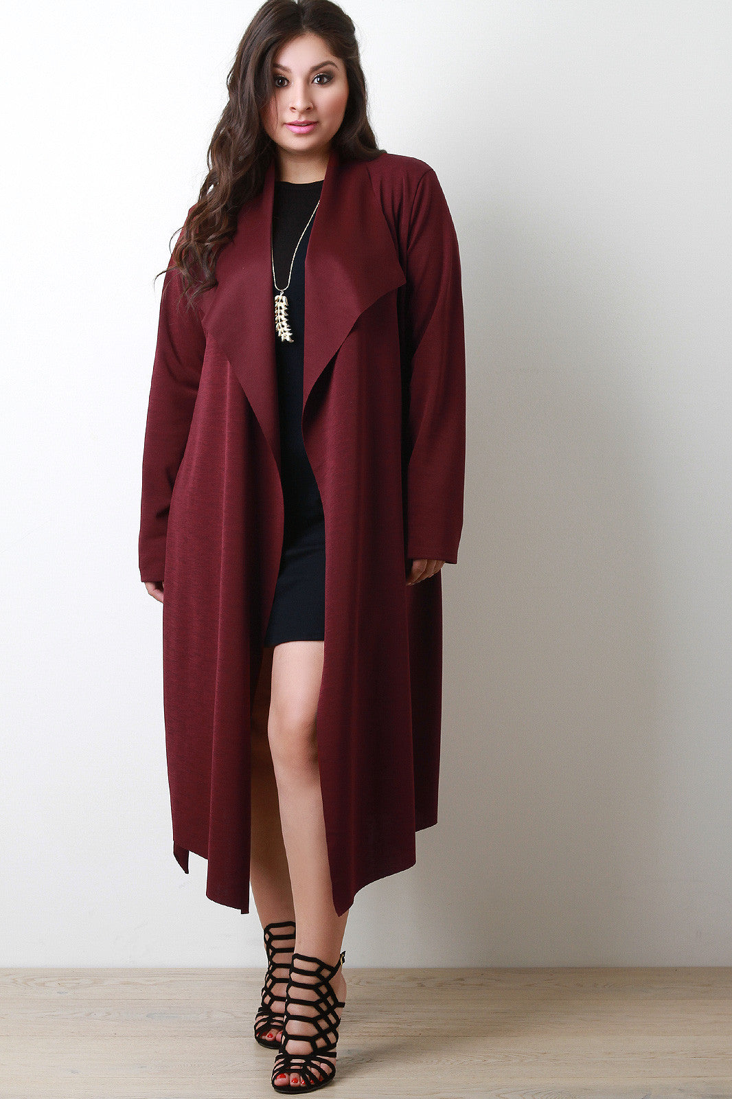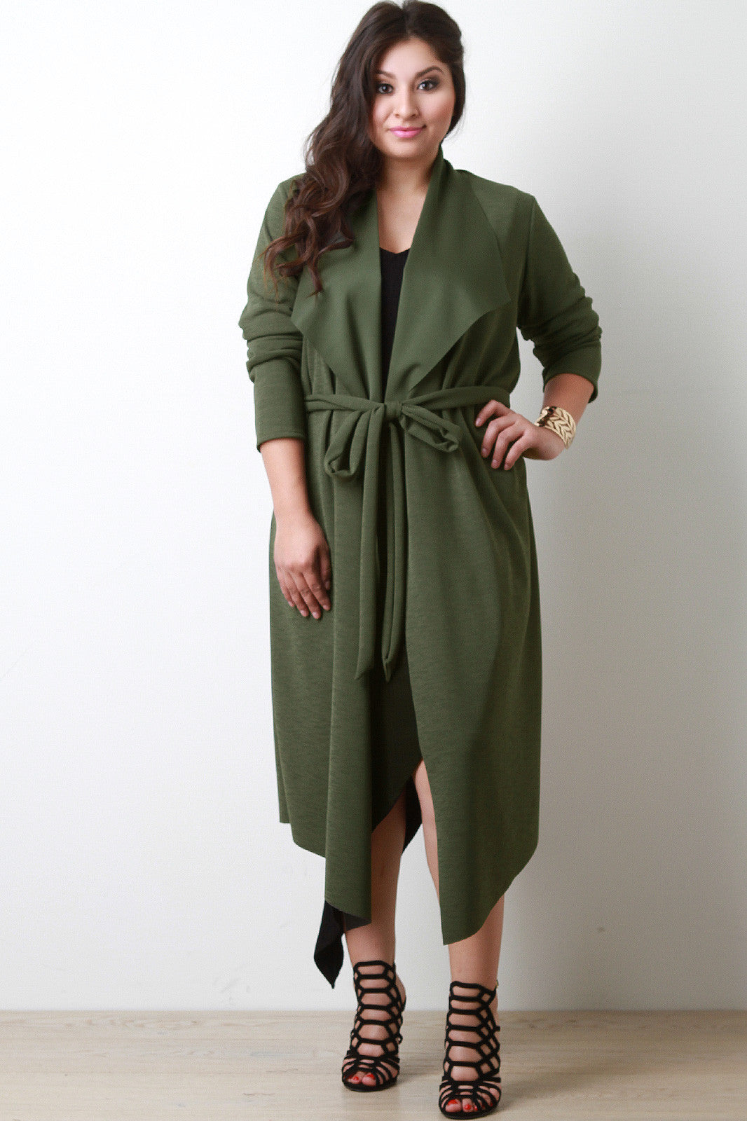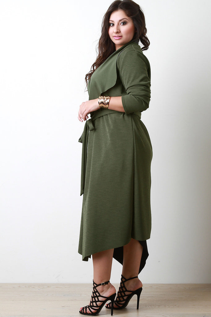 This longline jacket features a seamless open front with large flap collar, long sleeves, and cinched with a self-tie waist. Accessories sold separately. Made in U.S.A. 95% Polyester, 5% Spandex.