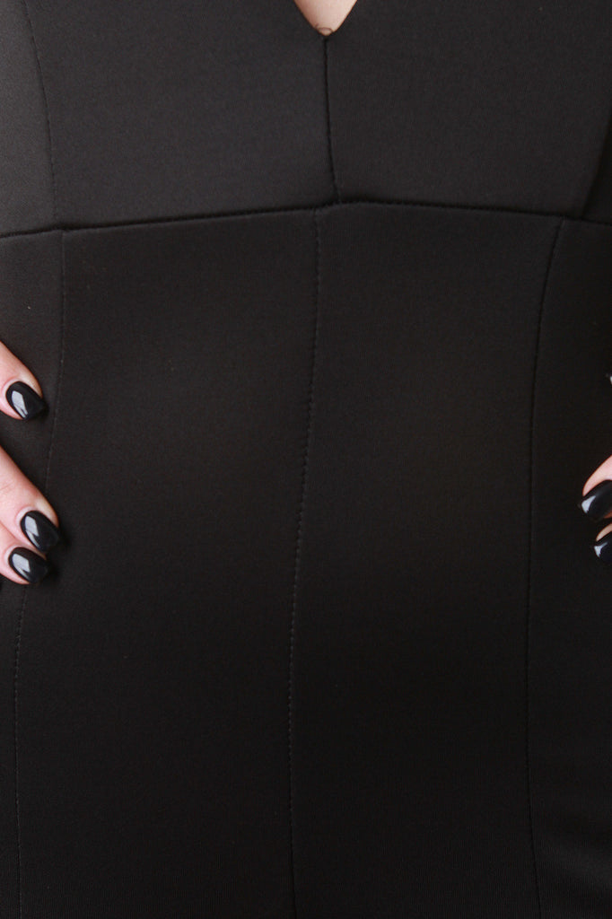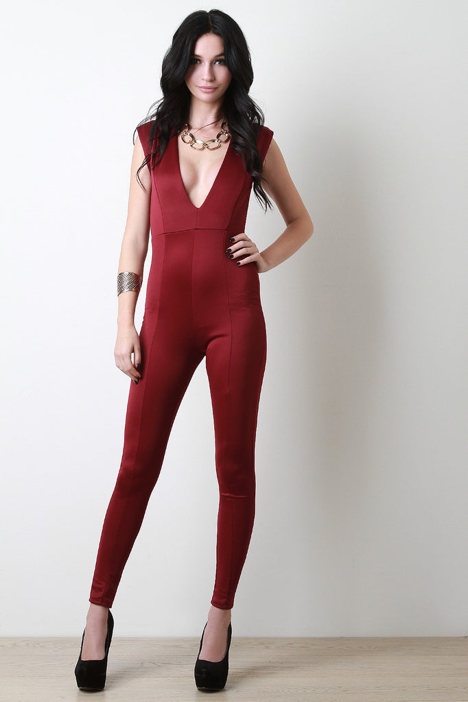 A sleek jumpsuit featuring a plunging v-neckline, sleeveless construction with statement-making padded shoulders, and a high waist with tapered pants legs. Finished with a front seams design and concealed back zipper closure. Accessories sold separately. Made in U.S.A. 95% Polyester, 5% Spandex.