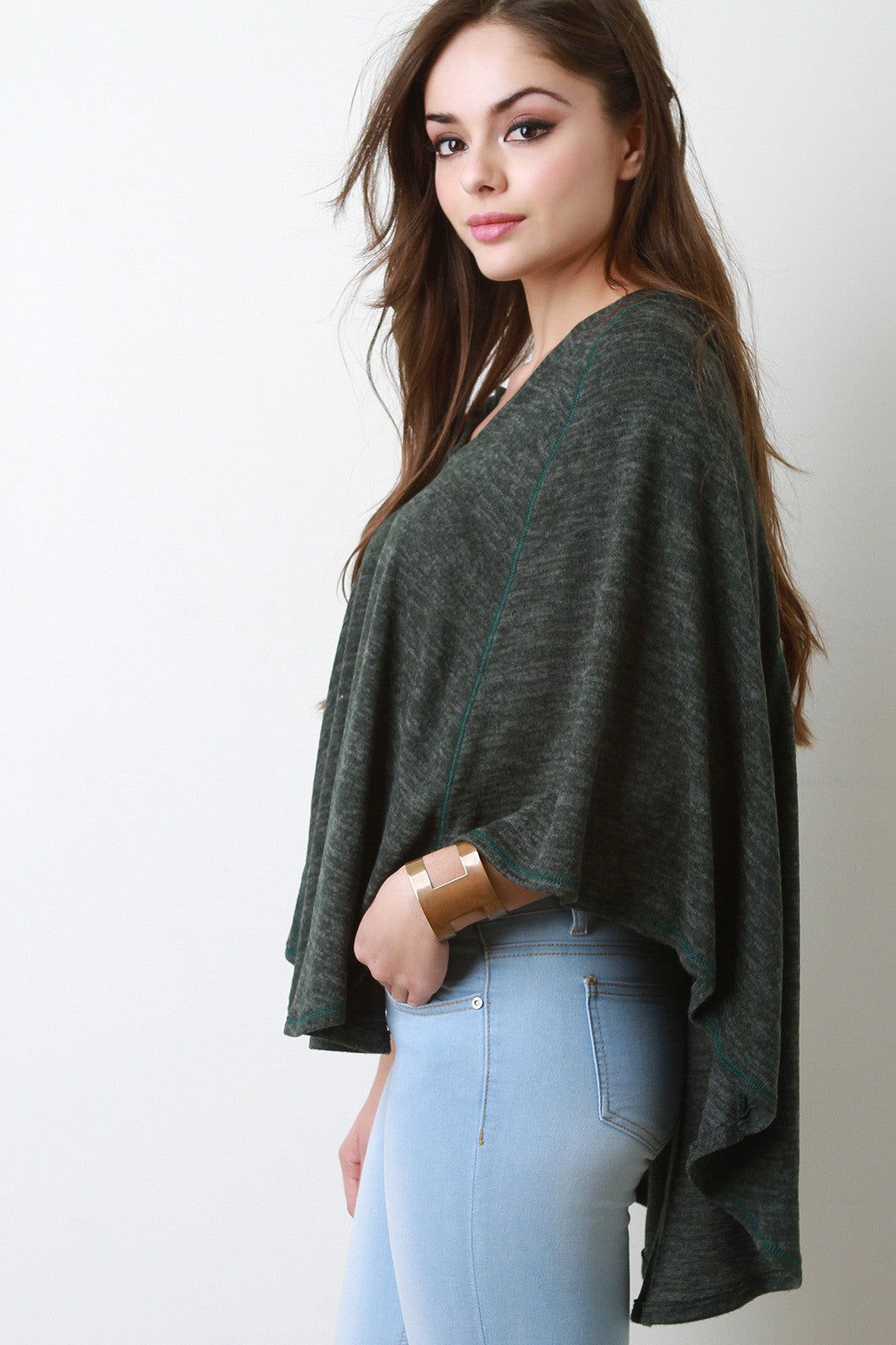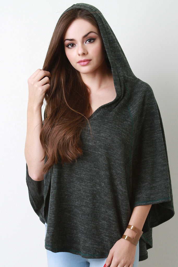 This hooded poncho features a soft marled knit fabrication, split neckline with attached hood, bottom sleeves design, and finished with high-low rounded hemline. Accessories sold separately. Made in U.S.A. 18 % Rayon, 79% Polyester, 3% Spandex.