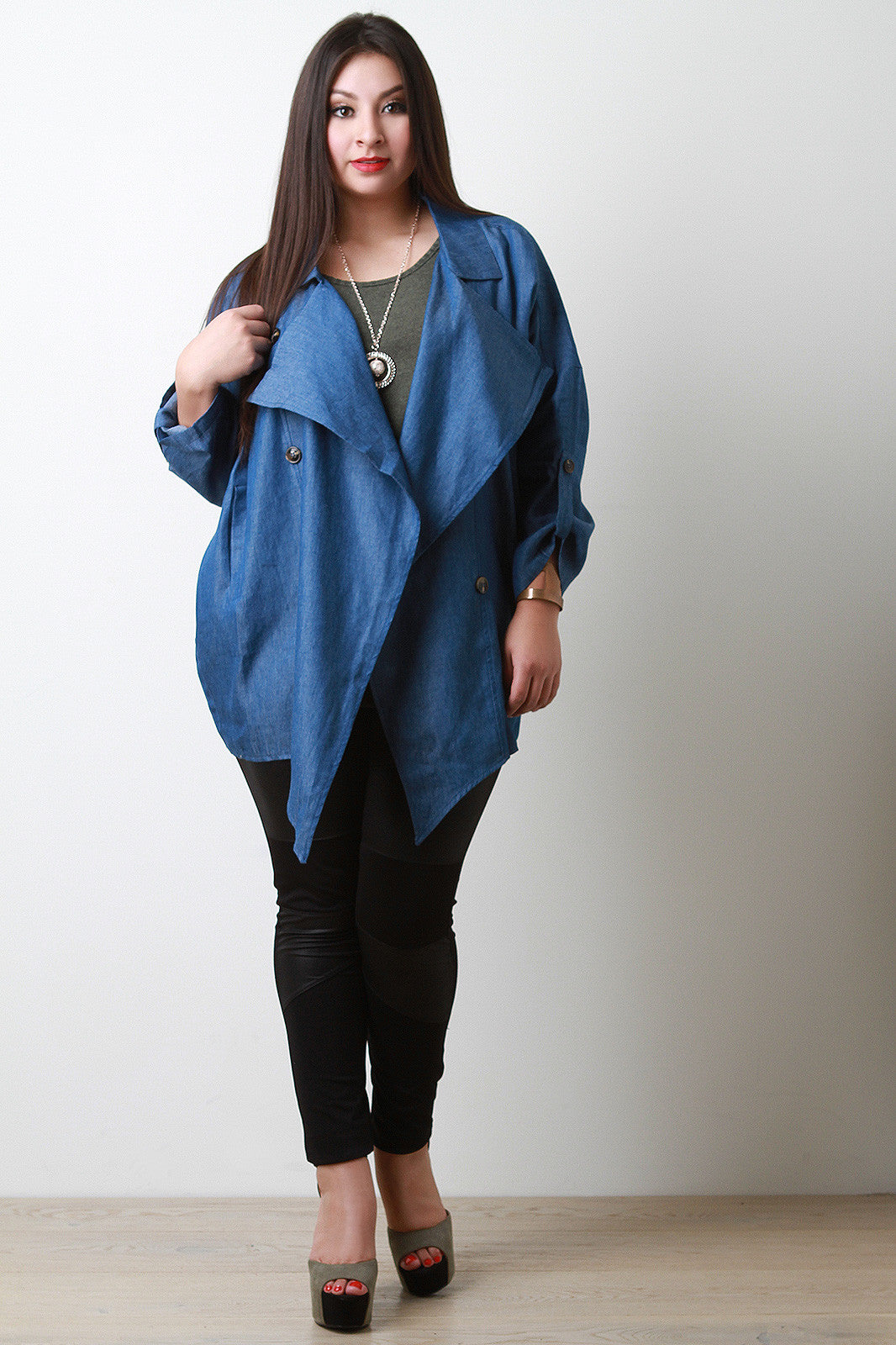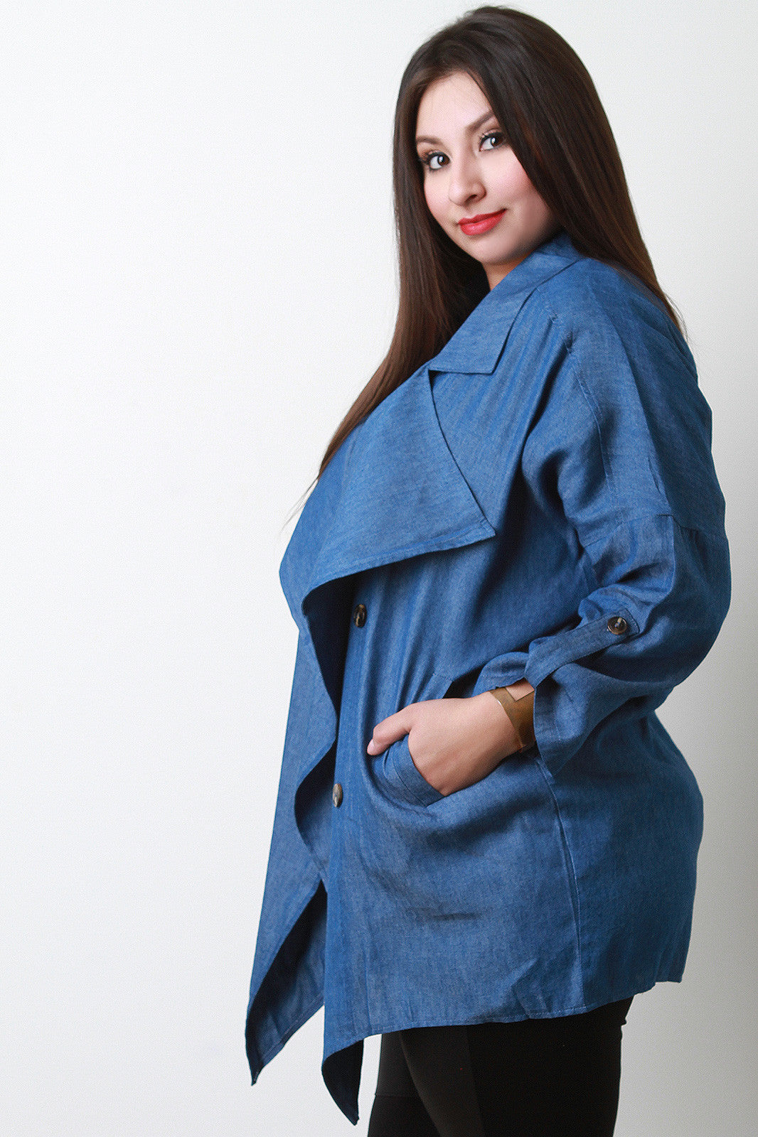 This plus size jacket features chambray denim, open front, oversized lapels, button decor, two side pockets, long sleeves, and asymmetrical hem. Accessories sold separately. 65% Cotton, 35% Polyester.