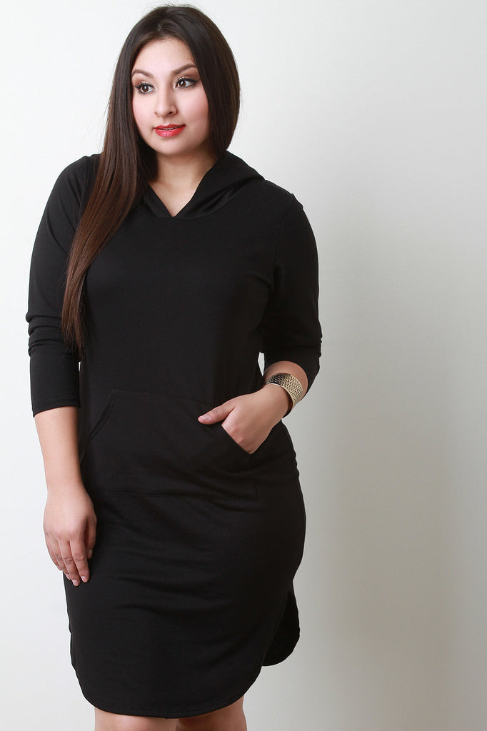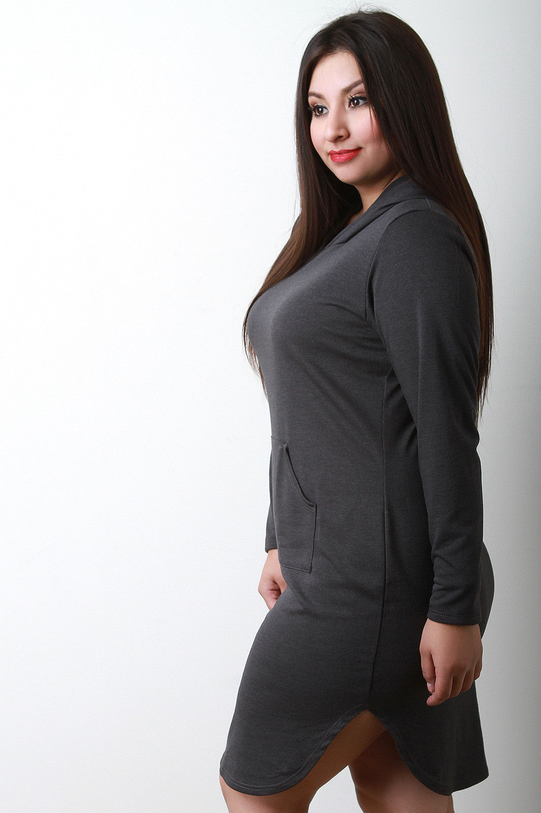 A plus size dress featuring a smooth jersey knit, v-neck with hood, and long fitted sleeves. Finished with a kangaroo pocket at the front, side slits, and a rounded hem. Accessories sold separately. 48% Polyester, 48% Rayon, 2% Spandex.