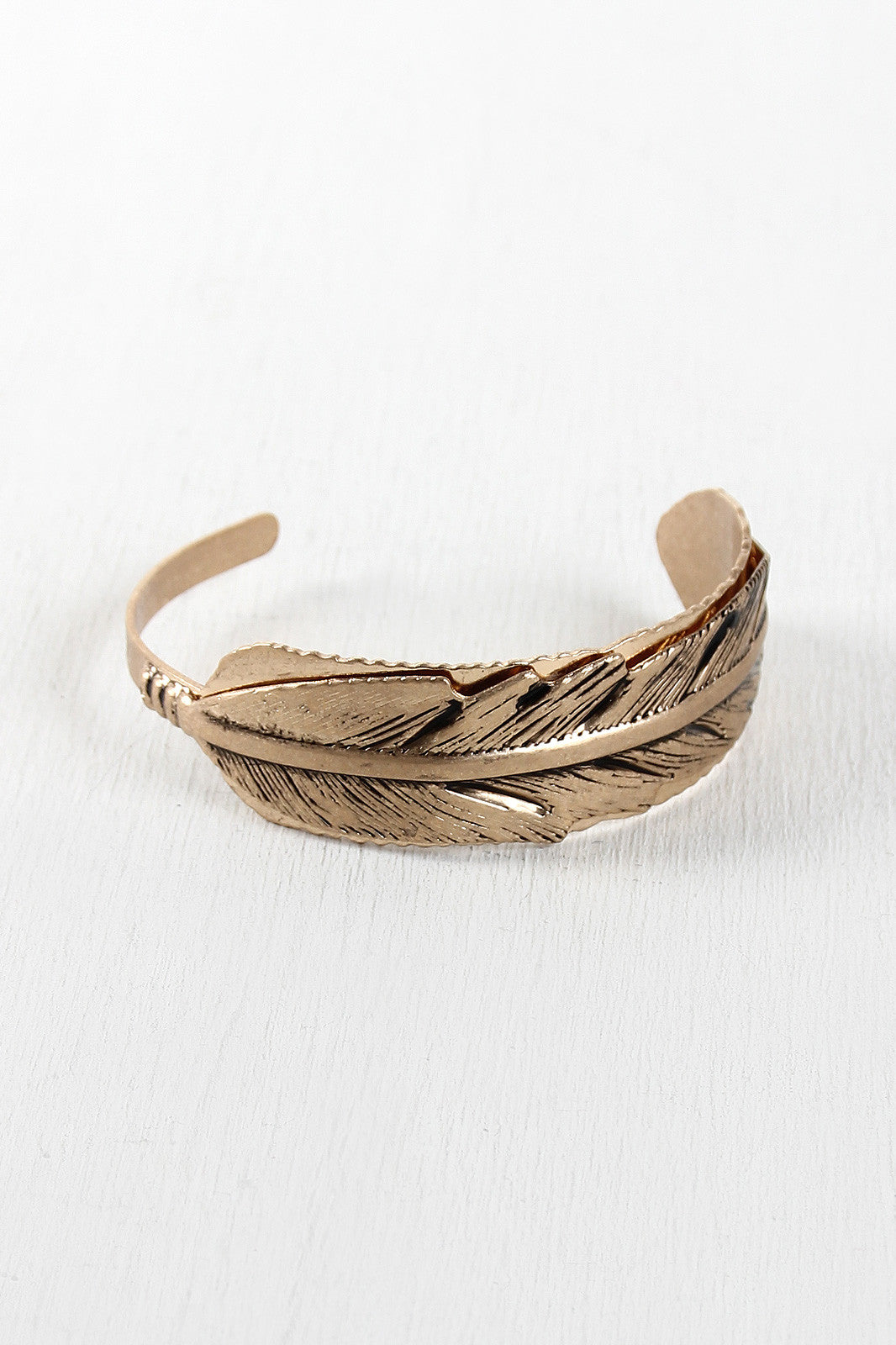 An open-ended metallic bangle with a curved feather motif. Non-adjustable. Lead and nickel compliant.