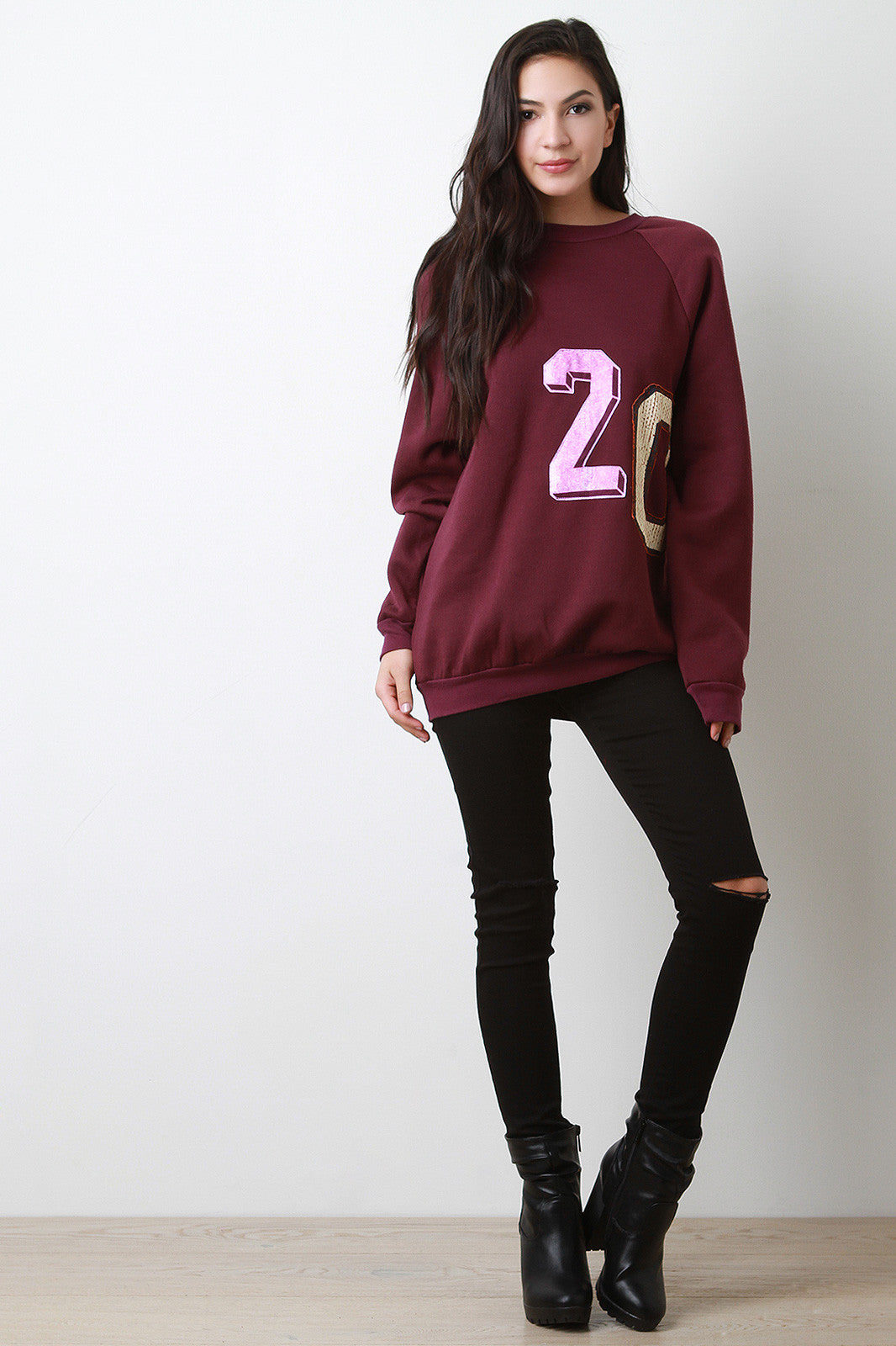 This comfy sweatshirt features a crew neckline, jersey knit fabrication with distressed number 20 stitched design at front, and long sleeves construction. Finished with banded cuff and hem. Accessories sold separately. Made in U.S.A. 100% Polyester.