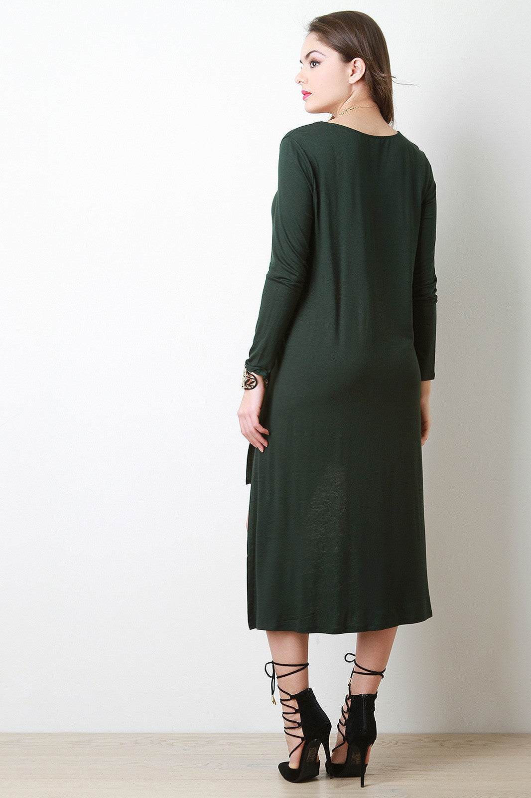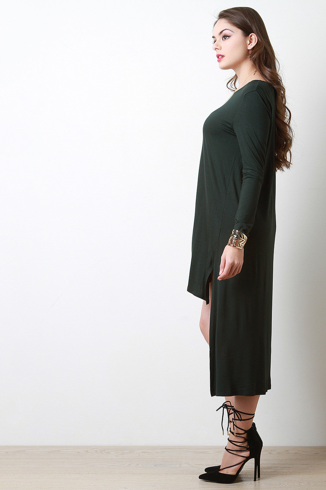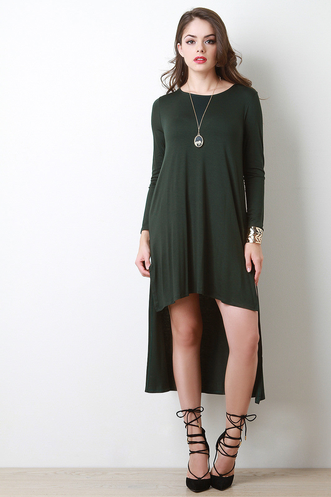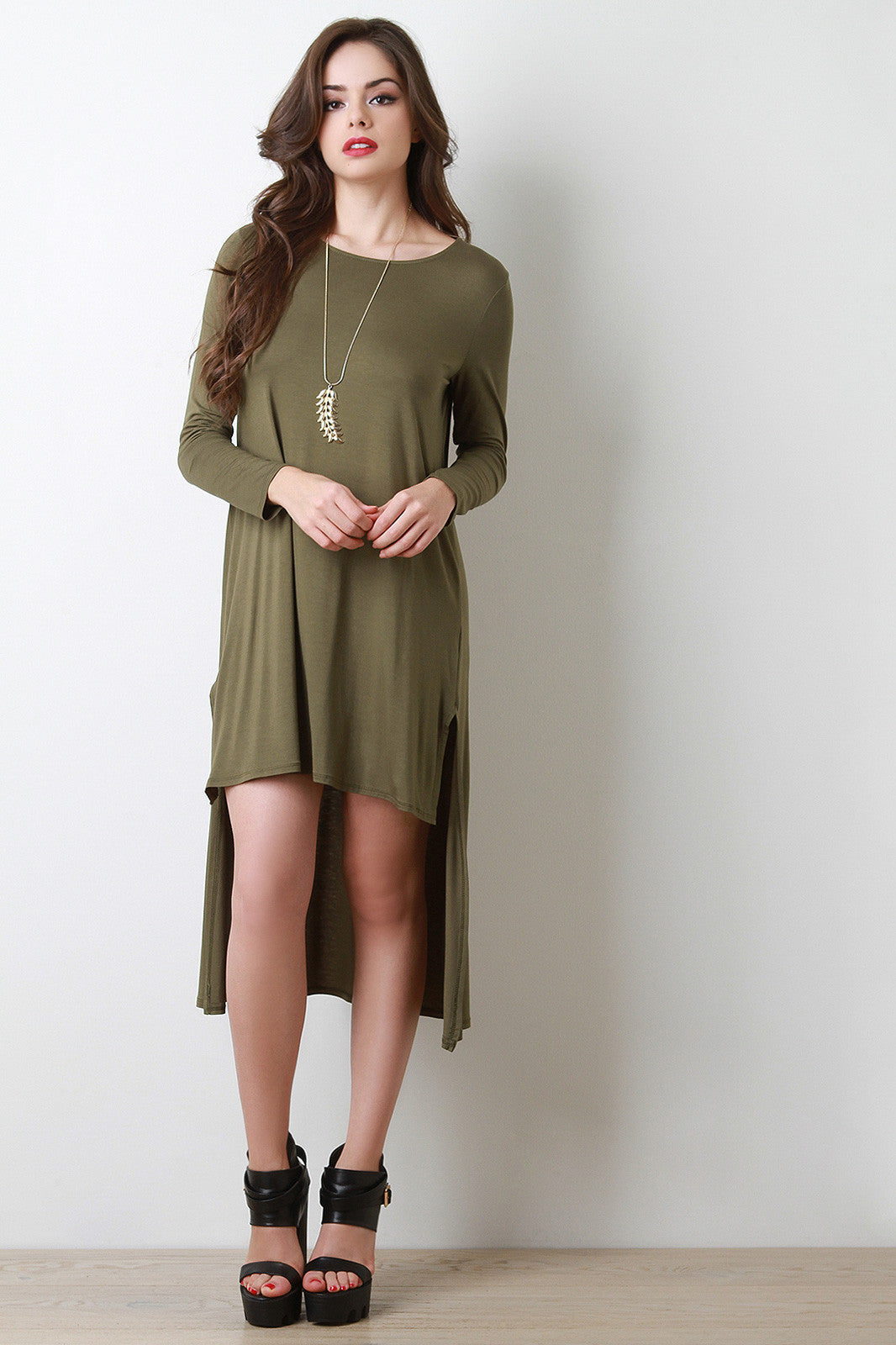 A long sleeves , and high-low hemline with side slits. Accessories sold separately. Made in U.S.A. 95% Viscose, 5% Spandex.