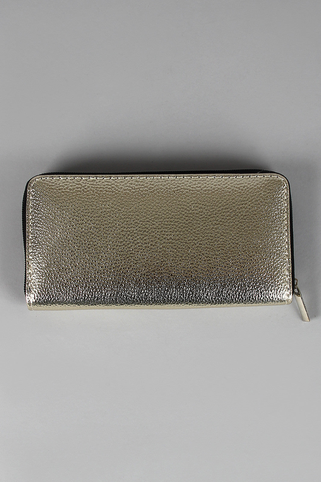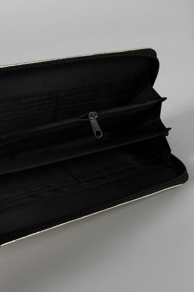 A clutch style walle t featuring metallic vegan leather, printed front design, and full zip-around closure. The interior features three main sections with gusseted sides, card slots, and zipper pocket for coins.