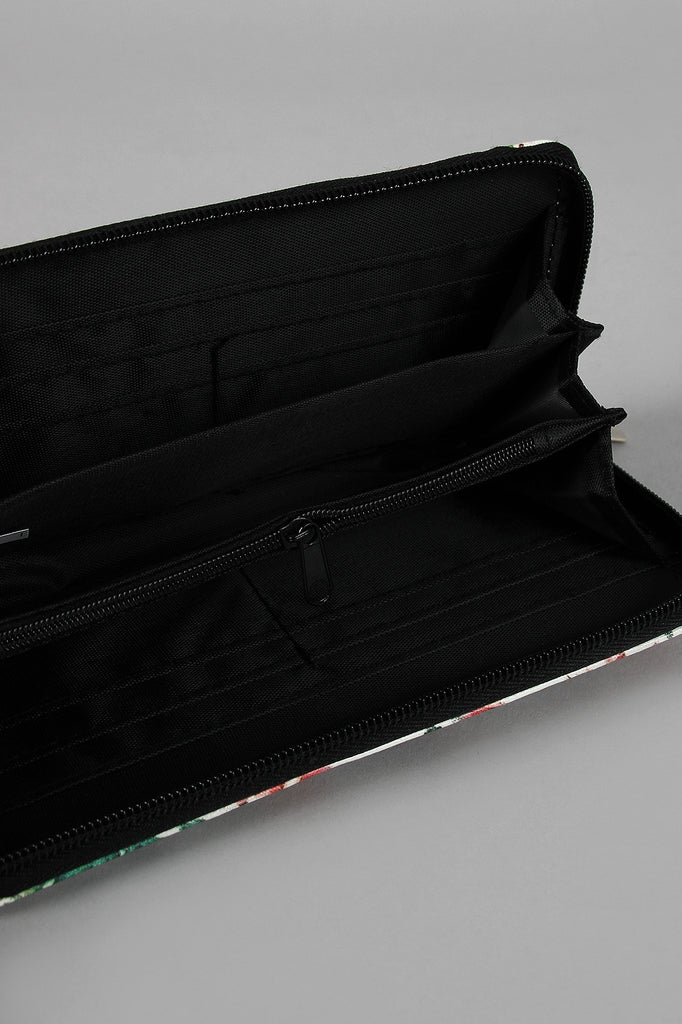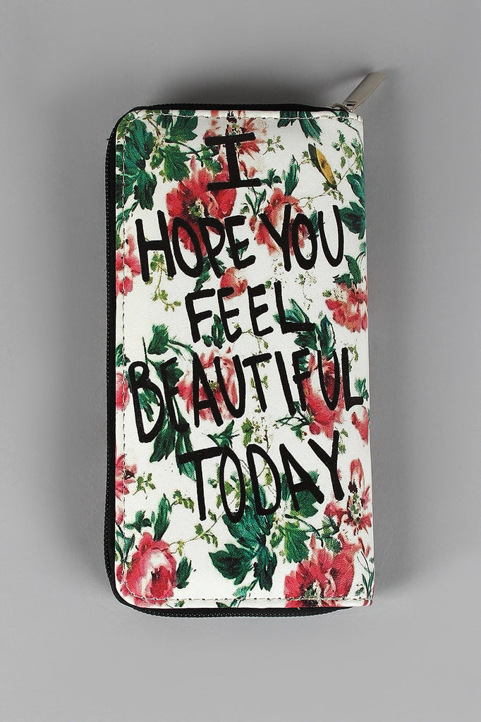 A clutch style floral pattern throughout, and emblazoned with the phrase "I Hope You Feel Beautiful Today" on both sides. Also features three main interior compartments with card slots and zipper pocket, gusseted sides, and a full zip-around closure.