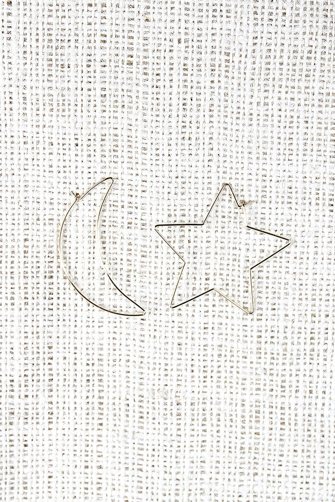 Delicate wire hoop earrings featuring a crescent shape and a star shape with hook closures.