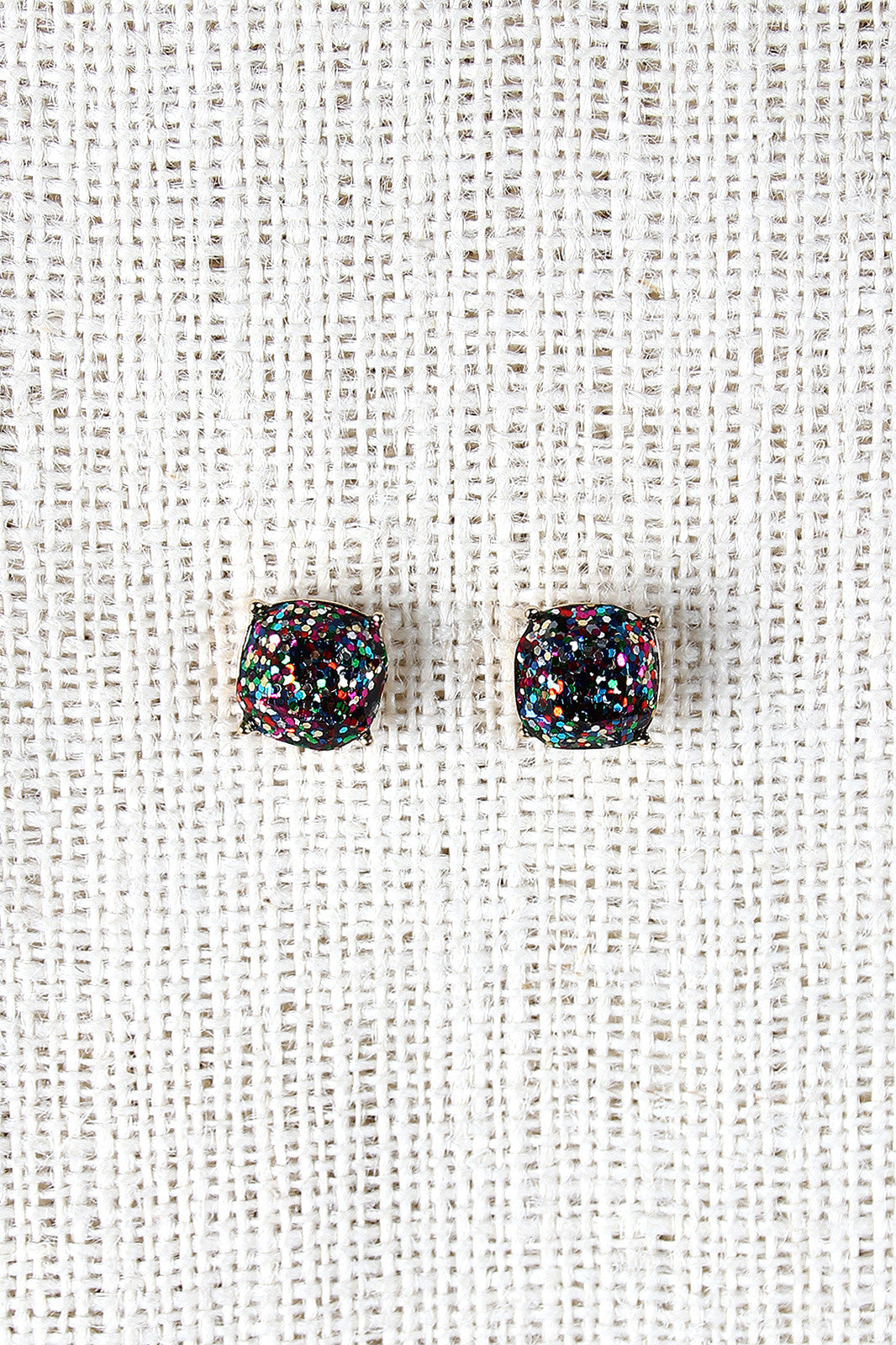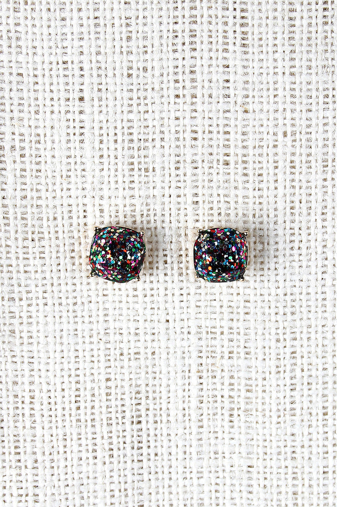 Party-ready earrings featuring a large cushion cut gem covered in glitter and finished with a post back.