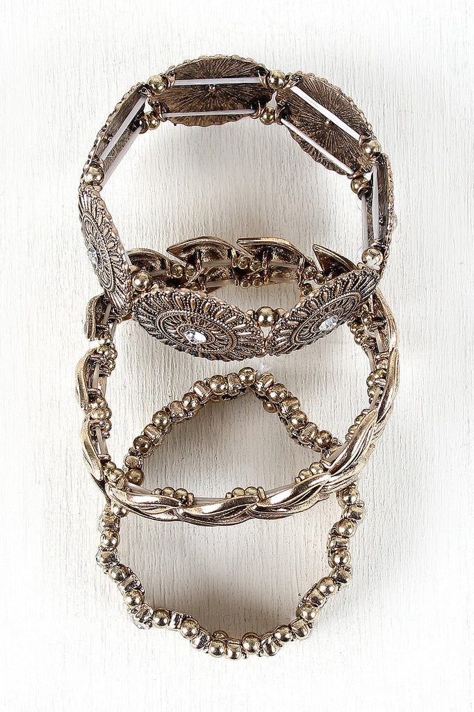 A set of three textured metallic bracelets with elastic construction and rhinestone accents.