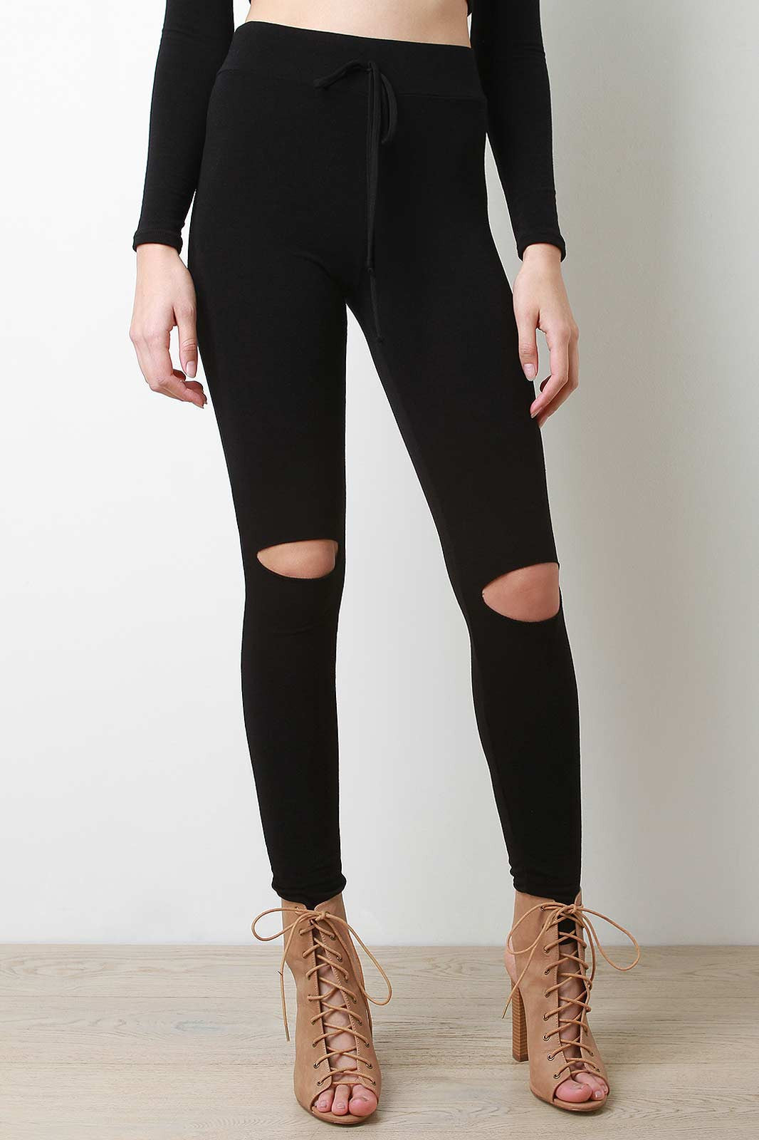 These high waisted leggings features a wide elasticized band, drawstring d�cor, taper cut fit, and knee slit design. Accessories sold separately. Made in U.S.A. 48% Rayon, 48% Polyester, 4% Spandex.