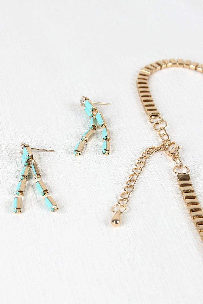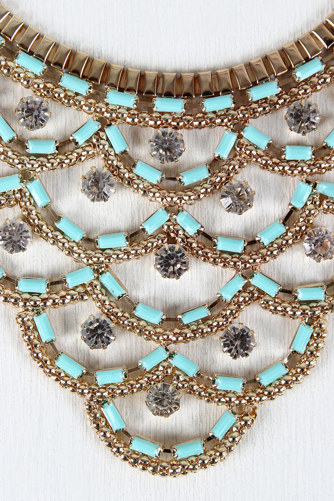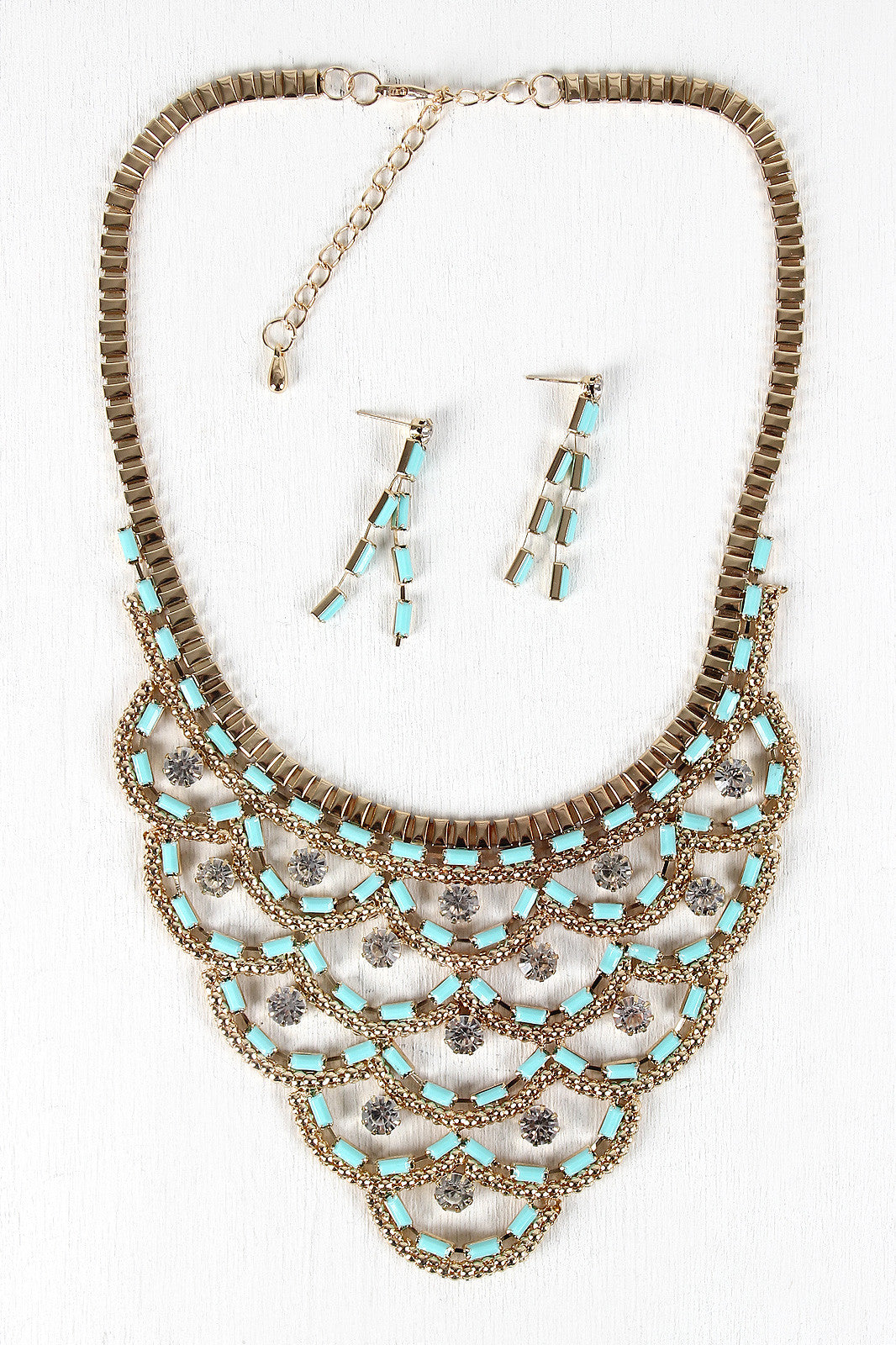 A statement bib necklace featuring an omega chain main, flat scalloped design constructed from popcorn chain, and acrylic color accents. Finished with suspended rhinestones and adjustable lobster hook closure. Necklace includes matching earrings.