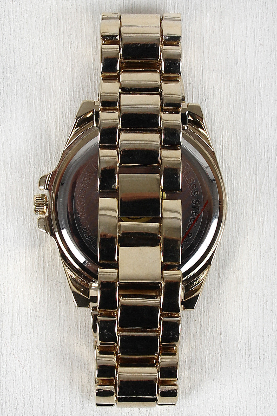 This watch features a round frame with gold etched textured face, bracelet link straps, and adjustable snap clasp closure.